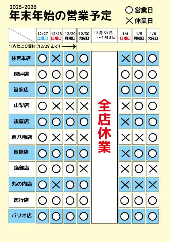店舗によっては年内が12月27日までの店舗がございますのでご確認をお願い致します。